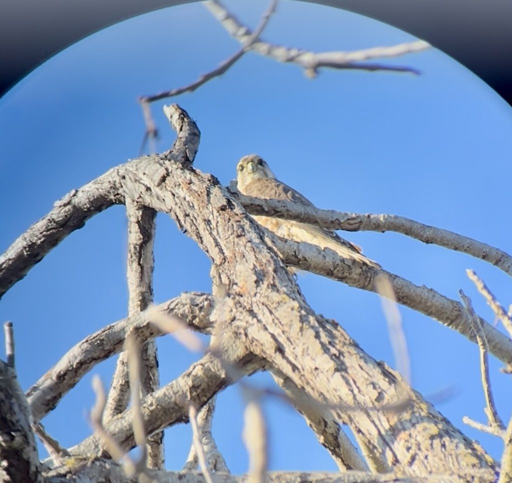 Merlin (a small species of falcon) in Lisa Myers’ walnut tree – through the scope